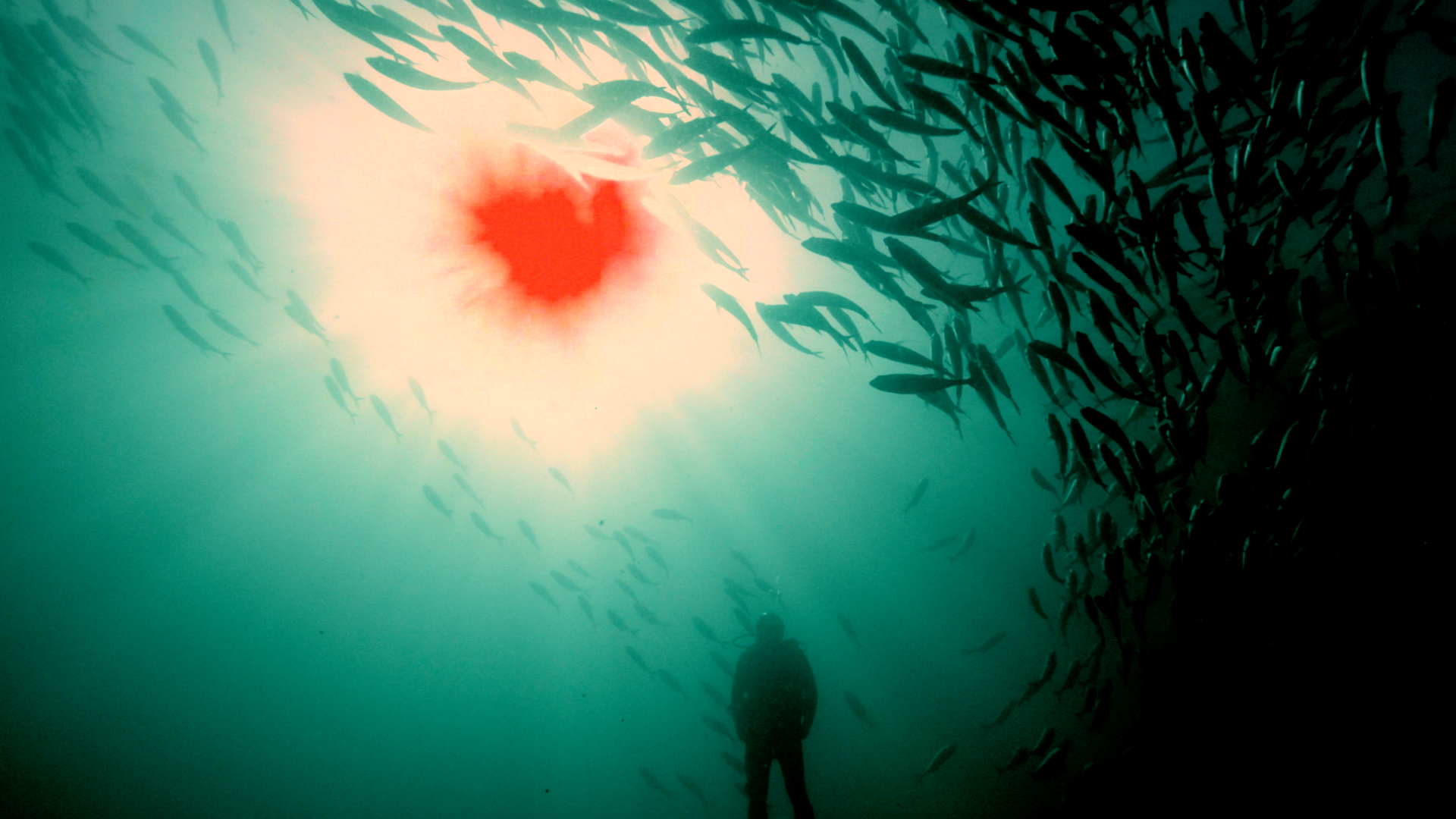 SOL ROJO és la peça que culmina aquest viatge des de la foscor i el fred de les profunditats marines, cap a la llum, el color i els signes de vida. Una tempesta de peixos gira al voltant d’una figura immòbil, que oscil·la ingràvida amb el fluir de l’aigua. Des de l’interior de la mar podem observar la font de llum i calor: un sol vermell, líquid, flota en l’aigua.